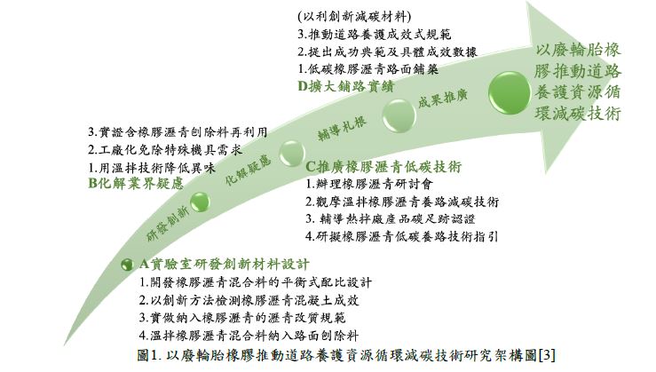 本研究以「輪胎循環高值化、道路養護低碳排」為願景,結合輪胎回收業與熱拌瀝青業,應用鋪路工程的新式技術,執行為期兩年的「以廢輪胎橡膠推動道路養護資源循環減碳技術」,開發創新橡膠瀝青低碳鋪路材料;在研發創新、化解疑慮、輔導扎根、及成果推廣四大方向,展開完成(1)開發橡膠瀝青混合料的平衡式配比設計、(2)以創新方法檢測橡膠瀝青混凝土成效、(3)實做納入橡膠瀝青的瀝青改質規範、(4)溫拌橡膠瀝青混合料納入路面刨除料、(5)用溫拌技術降低異味、(6)工廠化免除特殊機具需求、(7)實證含橡膠瀝青刨除料再利用、(8)辦理橡膠瀝青研討會、(9)觀摩溫拌橡膠瀝青養路減碳技術、(10)輔導熱拌廠產品碳足跡認證、(11)研擬橡膠瀝青低碳養路技術指引、(12)低碳橡膠瀝青路面鋪築、(13)提出成功典範及具體成效數據、及(14)推動道路養護成效式規範等共14項工作;在實驗室與試辦專案案中充份應用開發的材料設計方法及品質檢測方式,完善品管檢驗與材料設計試驗的一致性及有效性;突破資源限制委託美國瀝青科技中心以成效分級體系對國內瀝青材料進行檢測,引進AASHTO M323規範,檢測黏結料的抗車轍與抗開裂特性,促進選對材料及優化環保材料;鋪築二段溫拌橡膠瀝青越級配路面,有效降低製程溫度消除瀝青煙及異味,試鋪一段工廠化橡膠瀝青鋪面免除特殊拌合機具的需求,也紀錄實證老舊的橡膠瀝青路面得以順利刨除再利用回路面工程;成果推廣方面,則綜合擬訂「橡膠瀝青低碳養路技術指引」,指引國內鋪面工程人員參照先進技術規範,據以執行高效低碳的道路鋪面養護工作,邁向道路養護低碳排的目標。
